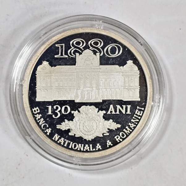 Revers: Anul 1880 (anul înființării BNR), palatul vechi al BNR, sigla BNR și inscripția „130 ANI”.