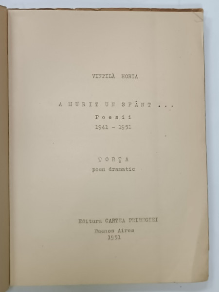 A MURIT UN SFANT de VINTILA HORIA , POEME / TORTA , POEM DRAMATIC , COLEGAT , BUENOS AIRES , 1951