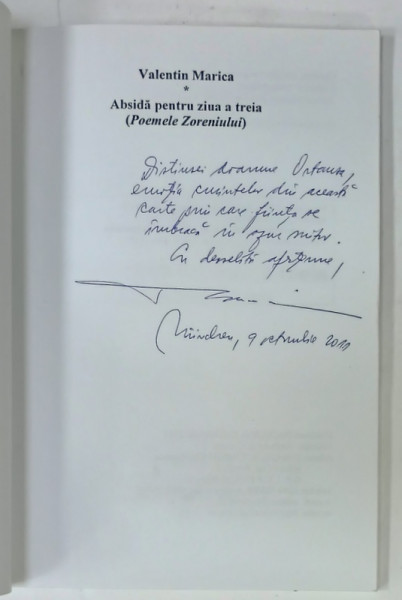 ABSIDA PENTRU ZIUA A TREIA ( POEMELE ZORENIULUI ) de VALENTIN MARICA , 2011, DEDICATIE *