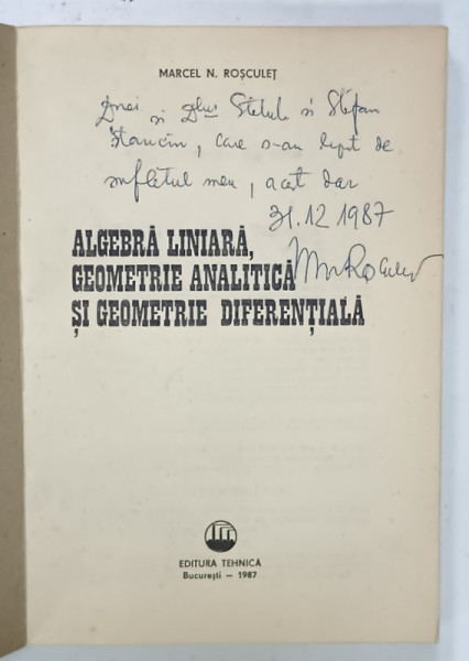 ALBEBRA LINIARA , GEOMETRIE ANALITICA SI GEOMETRIE DIFERENTIALA de M. ROSCULET , 1987 , DEDICATIE *