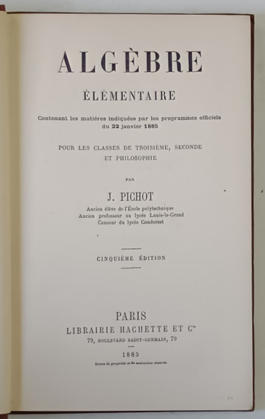 ALGEBRE ELEMENTAIRE , POUR LES CLASSES DE TROISIEME , SECONDE ET PHILOSOPHIE , CINQUIEME EDITION par J. PICHOT , 1885