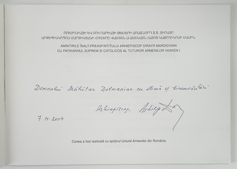 AMINTIRILE INALT - PREASFINTITULUI ARHIEPISCOP DIRAYR MARCHIDIAN CU PATRIARHUL SUPREM SI CATOLICOS AL TUTUROR ARMENILOR VASKEN 1 , 2004 *DEDICATIE , *EDITIE BILINGVA
