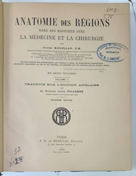 ANATOMIE DES REGIONS DANS SES RAPPORTS AVEC LA MEDECINE ET LA CHIRURGIE par GEORGE McCLELLAN , VOLUME I , 1906