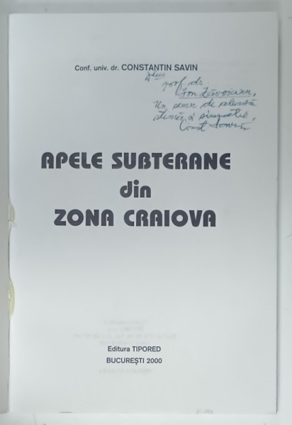 APELE SUBTERANE DIN ZONA CRAIOVA de CONSTANTIN SAVIN , 2001, DEDICATIE *