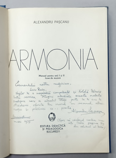 ARMONIA de ALEXANDRU PASCANU , MANUALE PENTRU ANII I , II , III si IV LICEE DE MUZICA , 1974 -1975 , 2 VOLUME , DEDICATIE *
