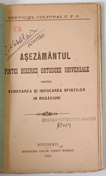 ASEZAMANTUL SFINTEI BISERICI ORTODOXE UNIVERSALE PENTRU VENERAREA SI INVOCAREA SFINTILOR IN RUGACIUNI , 1924 *DIN BIBLIOTECA CRISTIAN - NESTORESCU BALCESTI