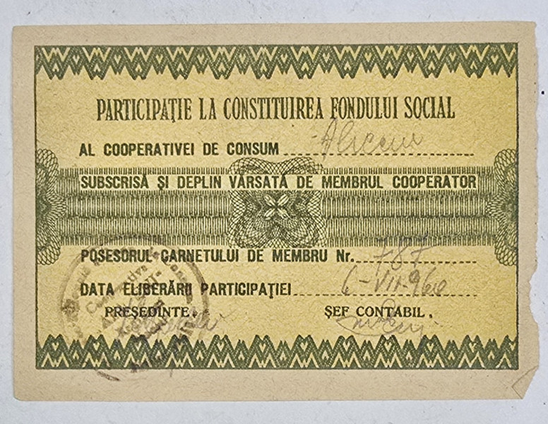 100 Lei, participatie la constituirea fondului social. Cooperativa de consum. Stare de conservare conform foto.
