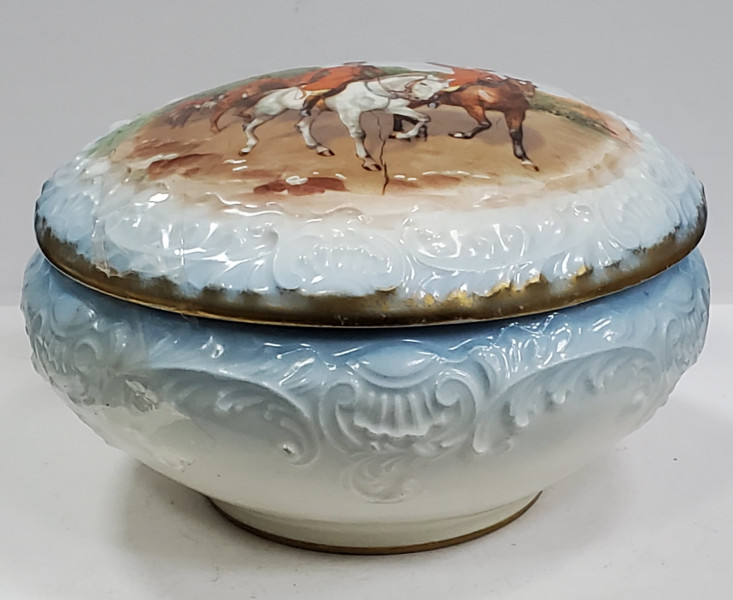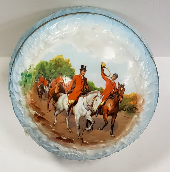 Bonboniera cu capac, Limoges, decorata cu scena de vanatoare, Secol XX