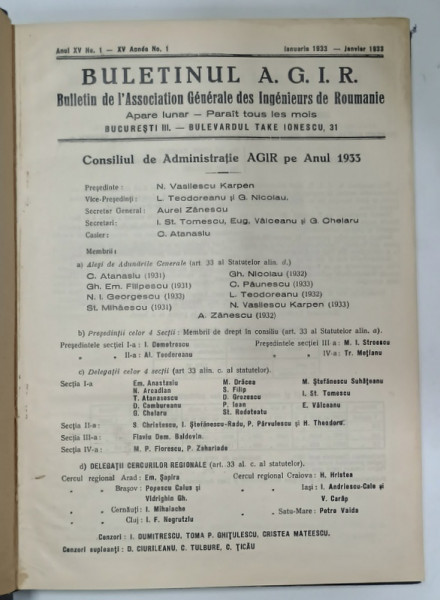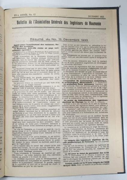 BULETINUL A.G.I.R. , BULLETIN DE L 'ASSOCIATION GENERALE DES INGENIEURS DE ROUMANIE , APARE LUNAR , ANUL XV COMPLET , NR. 1- 12 , IANUARIE - DECEMBRIE 1933 , COLEGAT