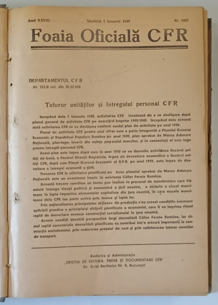 CAILE FERATE ROMANE , FOAIA DE CALCUL C.F.R. , NUMERELE 1957 - 2030 , VOLUMUL XXVIII , 1949
