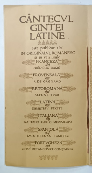 CANTECUL GINTEI LATINE de VASILE ALECSANRI , APARUT CU OCAZIA LOCURILOR LATINITATII , AVIGNON , MAI 1978 , SEMNATA DE PARTICPANTII ROMANI