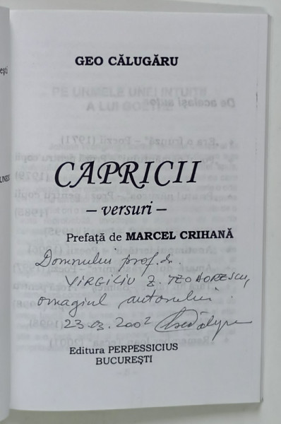 CAPRICII , VERSURI de GEO CALUGARU , 2001 *DEDICATIE