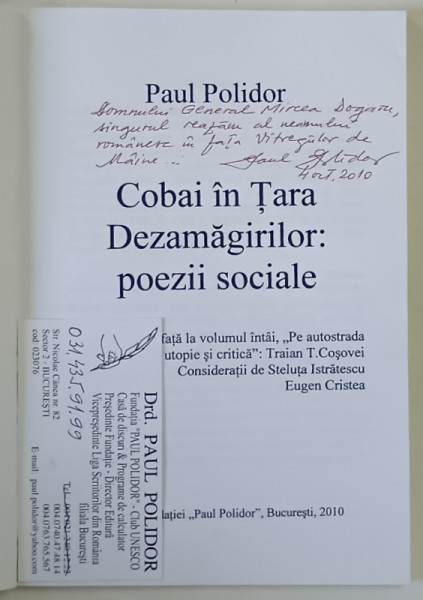 COBAI IN TARA DEZAMAGIRILOR , POEZII SOCIALE de PAUL POLIDOR , 2010 *DEDICATIE