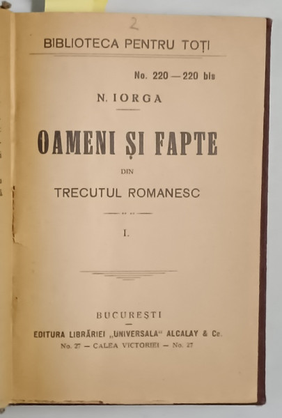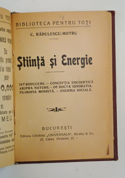 EDITURA LIBRARIEI ALCALAY et CO. , CONTINE : 1. CUGETARI ASUPRA POPOARELOR VECHI de G.T. BUZOIANU - 80 PAGINI , 2. OAMENI SI FAPTE DIN TRECUTUL ROMANESC de N. IORGA - 128 PAGINI , 3. INTREBUINTAREA VIETII de SIR JOHN LUBBOCK -94 PAGINI , 4. STIINTA SI ENERGIE de C. RADULESCU - MOTRU - 122 PAGINI , FORMAT MIC , LEGATURA CARTONATA