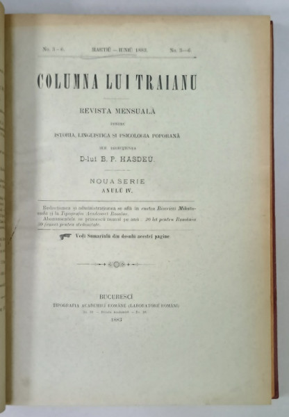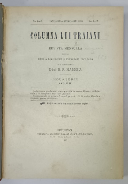 COLUMNA LUI TRAIAN , REVISTA MENSUALA PENTRU ISTORIA , LINGUISTICA SI PSICOLOGIA POPORANA , ANUL IV , COMPLET , IANUARIE -DECEMBRIE 1883 , COLEGAT DE 12 NUMERE