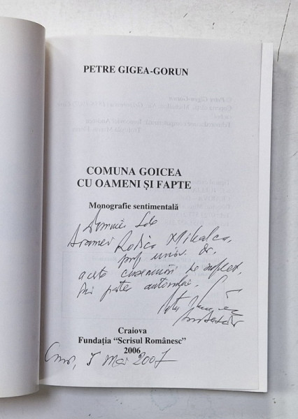 COMUNA GOICEA CU OAMENI SI FAPTE , MONOGRAFIE SENTIMENTALA de PETRE GIGEA - GORUN , 2006
