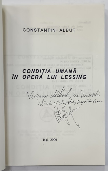 CONDITIA UMANA IN OPERA LUI G.E. LESSING de CONSTANTIN ALBUT , 2000 , DEDICATIE *