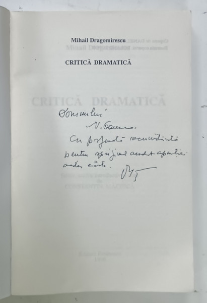 CRITICA DRAMATICA de MIHAI DRAGOMIRESCU , editie de CONSTANTIN MACIUCA , 1996 , DEDICATIE * , PREZINTA HALOURI DE APA SI URME DE UZURA
