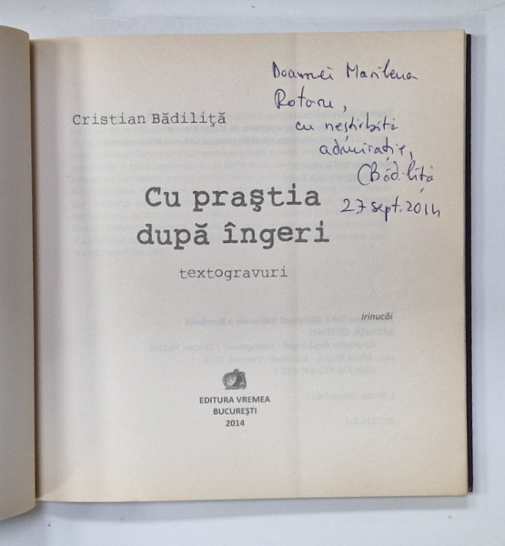 CU PRASTIA DUPA INGERI de CRISTIAN BADILITA , TEXTOGRAVURI , 2014 , DEDICATIE *