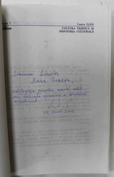 CULTURA TEHNICA SI INDUSTRIA CULTURALA de LAURA PANA , 2002 , DEDICATIE *