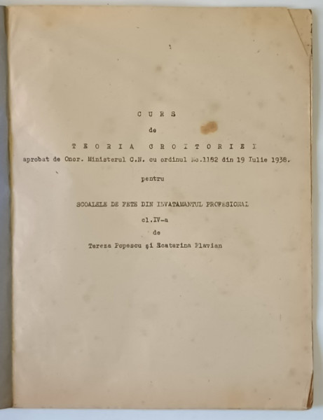 CURS DE TEORIA CROITORIEI PENTRU FETE DIN INVATAMANTUL PROFESIONAL , CLASA A -IV -A de TEREZA POPESCU si ECATERINA FLAVIAN , 1938 , PREZINTA URME DE UZURA