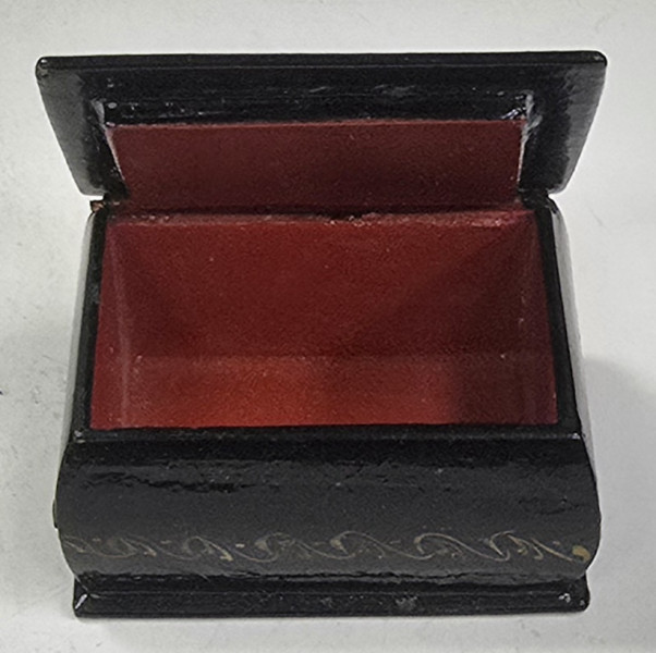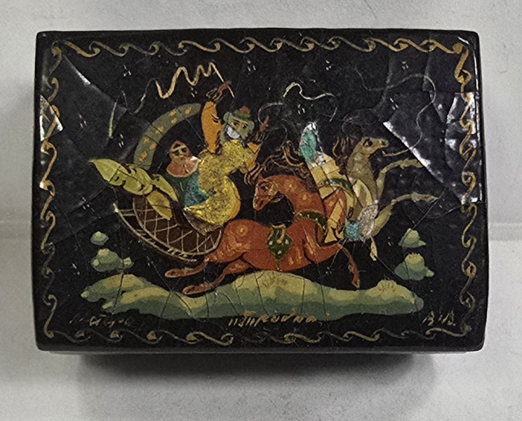CUTIUTA DIN LEMN LACUIT , PICTATA MANUAL , SCENA DE IARNA , RUSIA , PERIOADA INTERBELICA