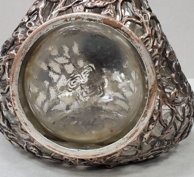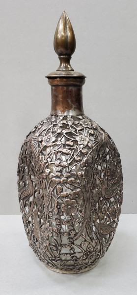 Decantor din sticla cu montura argintata, decorat cu motive florale si avimorfe.