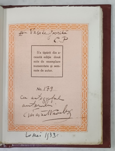 DEDICATIE SCRISA SI SEMNATA OLOGRAF CU CERNEALA NEAGRA , PE PAGINA DE JUSTIFICARE A TIRAJULUI , APROXIMATIV 100 DE PAGINI , EXEMPLAR NUMEROTAT , LEGATURA NOUA , CARTONATA