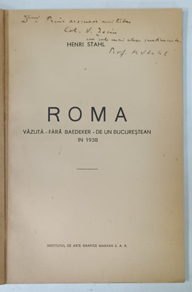 DEDICATIA LUI HENRI STAHL PE VOLUMUL SAU ' ROMA VAZUTA DE UB BUCURESTEAN , FARA BAEDECKER ' , 1939