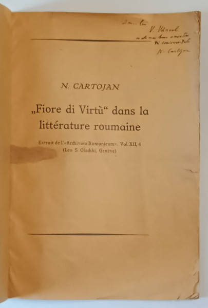 DEDICATIA LUI N. CARTOJAN pe VOLUMUL SAU ' FIORE DI VIRTU ' DANS LA LITTERATURE ROUMAINE , SFARISTUL SEC. XIX