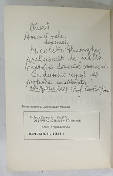 DESPRE ACADEMIILE VIETII UMANE de PROFESOR CONSTANTIN I. CALITOIU , 2020 , DEDICATIE *