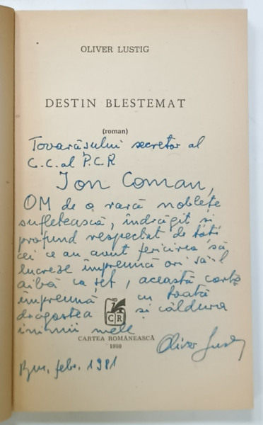 DESTIN BLESTEMAT , roman de OLIVER LUSTIG , 1980 , DEDICATIE CATRE ION COMAN * , SECRETAR C.C. AL P.C.R.