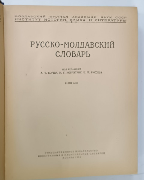 DICTIONAR RUS - MOLDOVENESC , 61000 DE CUVINTE , 1954 , TEXT IN LIMBA RUSA