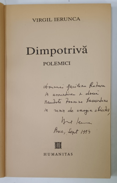 DIMPOTRIVA de VIRGIL IERUNCA , 1994 , DEDICATIE *