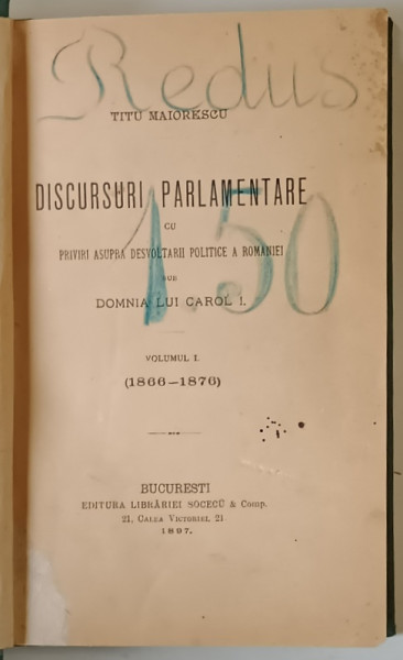 DISCURSURI PARLAMENTARE CU PRIVIRI ASUPRA DESVOLTARII POLITICE A ROMANIEI SUB DOMNIA LUI CAROL I , VOLUMUL I , 1866 - 1876 de TITU MAIORESCU , 1897