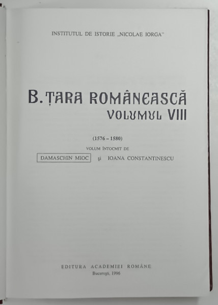 DOCUMENTA ROMANIAE HISTORICA , B. TARA ROMANEASCA ( 1576 - 1580 ) , VOLUMUL VIII , intocmit de DAMASCHIN MIOC si IOANA CONSTANTINESCU , 1996