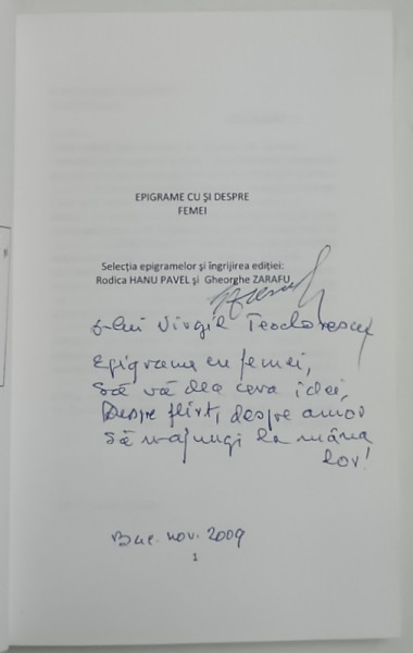 EPIGRAME CU SI DESPRE FEMEI , editie ingrijita de RODICA HANU PAVEL si GHEORGHE ZARAFU , 2008 *DEDICATIE