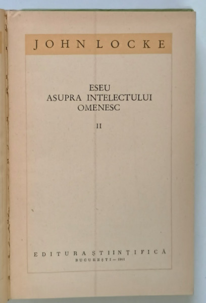 ESEU ASUPRA INTELECTULUI OMENESC , VOLUMUL II de JOHN LOCKE , 1961 *EDITIE CARTONATA