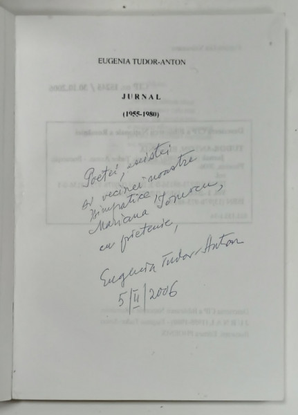 EUGENIA TUDOR ANTON , JURNAL ( 1955 - 1980 ) , APARUTA 2006 , DEDICATIE *