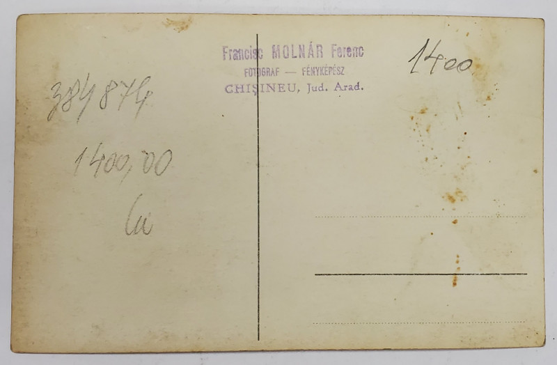 FOTOGRAF MOLNAR FERENC, CHISINEU , ARAD , MONOCROMA , NECIRCULATA , CU STAMPILA STUDIOULUI PE VERSO
