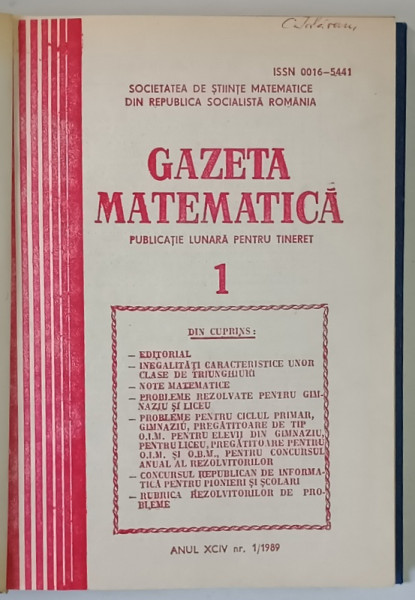 GAZETA MATEMATICA , PUBLICATIE LUNARA PENTRU TINERET , ANUL XCIV , NUMERELE I - XII , 1989 *LIPSA NUMARUL 8