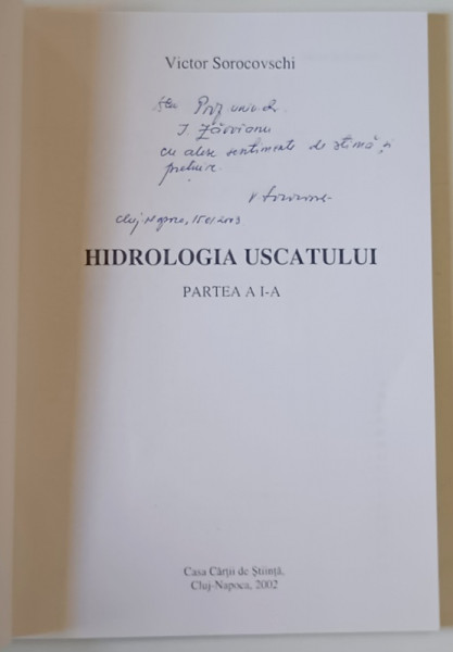 HIDROLOGIA USCATULUI de VICTOR SOROCOVSCHI , PARTEA I , 2002 , DEDICATIE *