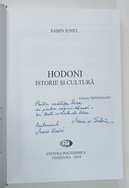 HODONI , ISTORIE SI CULTURA de SABIN IONEL , 2018 , DEDICATIE *