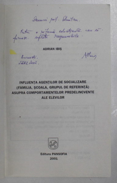 INFLUENTA AGENTILOR DE SOCIALIZARE ( FAMILIA , SCOALA , GRUPUL DE REFERINTA ) ASUPRA COMPORTAMENTELOR PREDELICVENTE ALE ELEVILOR de ADRIAN IBIS , 2001 , DEDICATIE *