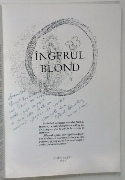 INGERUL BLOND de NICHITA STANESCU , 1993 *DEDICATIE
