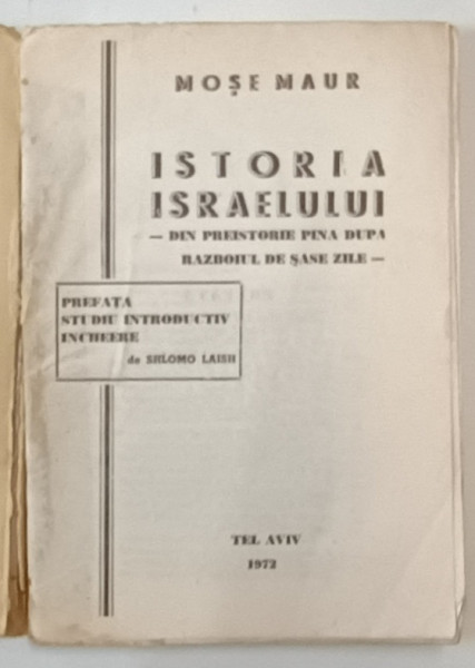 ISTORIA ISRAELULUI , DIN PREISTORIE PINA DUPA RAZBOIUL DE SASE ZILE - de MOSE MAUR , 1972 , COTOR LIPIT CU SCOTCH , PREZINTA PETE SI URME DE UZURA