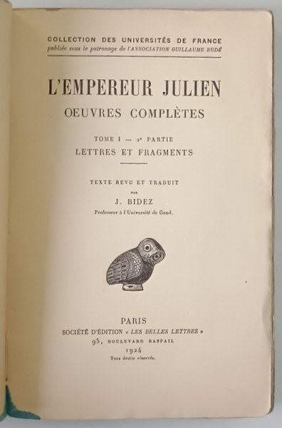 L ' EMPEREUR JULIEN , OEUVRES COMPLETES , TOME 1 , 2e PARTIE , LETTRES ET FRAGMENTS par J. BIDEZ , 1924