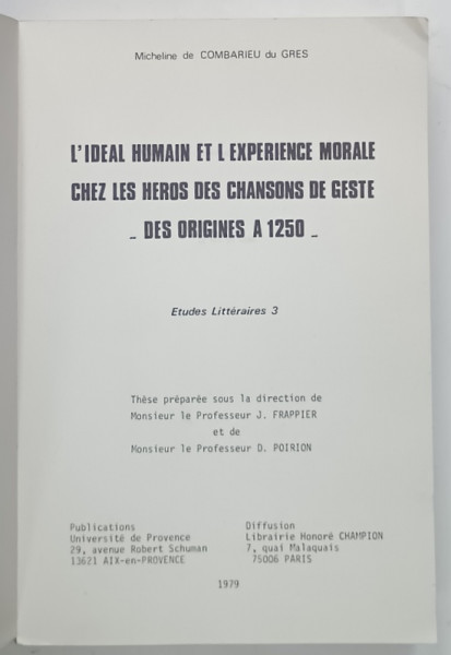 L 'IDEAL HUMAIN ET L 'EXEPERIENCE MORALE CHEZ LES HEROS DES CHANSON DE GESTE - DES ORIGINES A 1250 -par MICHELINE de COMBARIEU du GRES , TOME SECONDE , 1979