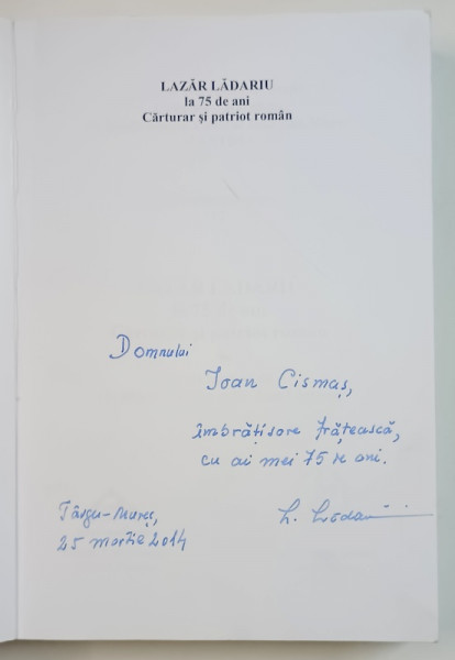 LAZAR LADARIU LA 75 DE ANI , CARTURAR SI PATRIOT ROMAN , editie ingrijita de FLORIN BENGEAN si IOAN LACATUSU , 2014 *DEDICATIE