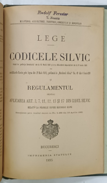 LEGE ASUPRA TAXELOR DE TIMBRU SI INREGISTRARE / LEGE PENTRU ORGANISAREA COMUNELOR RURALE / CODICELE SILVIC , CU UN INDICE ALFABETIC , 1895 -1906 , COLEGAT